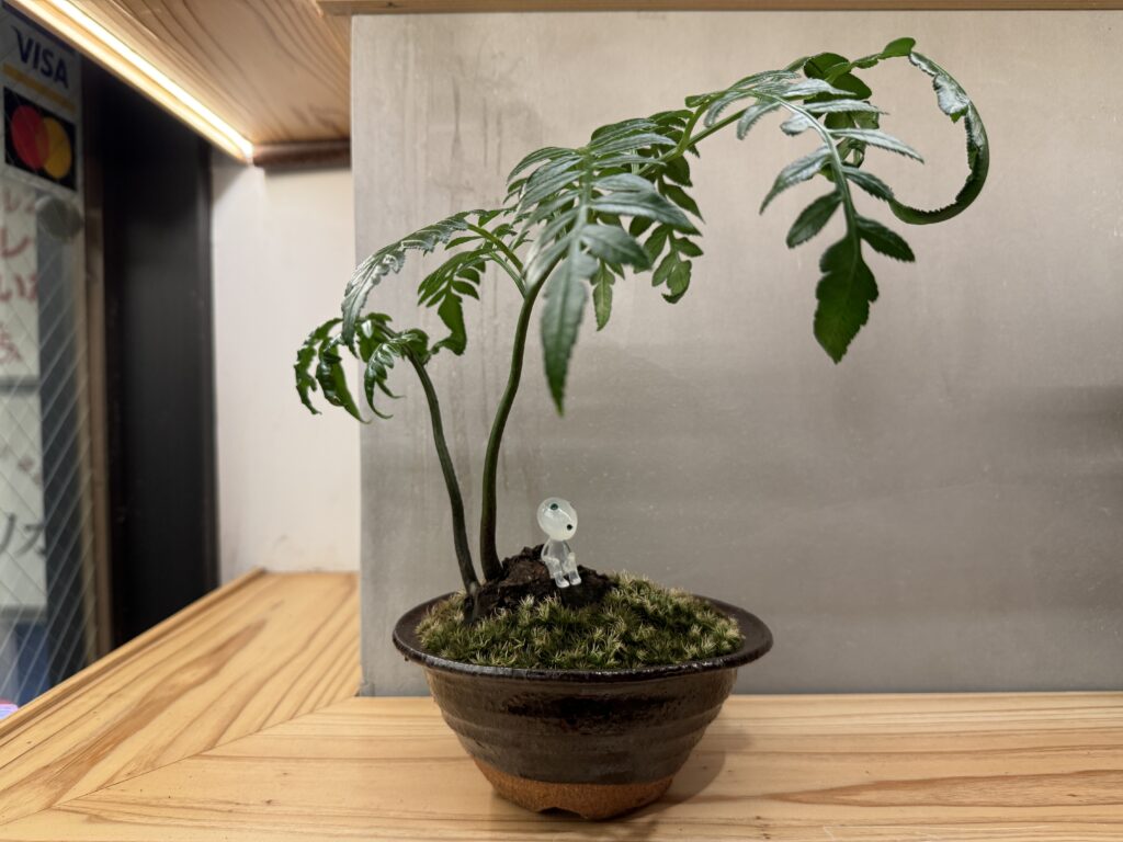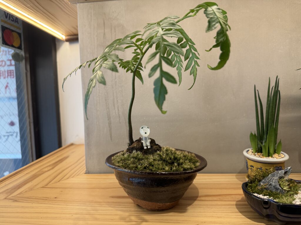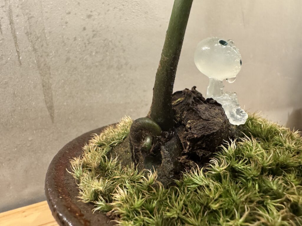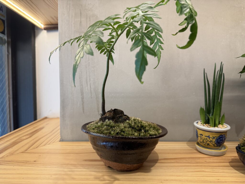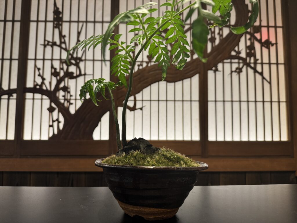 前回、焼き物の和風鉢と苔を使って盆栽風アレンジをした