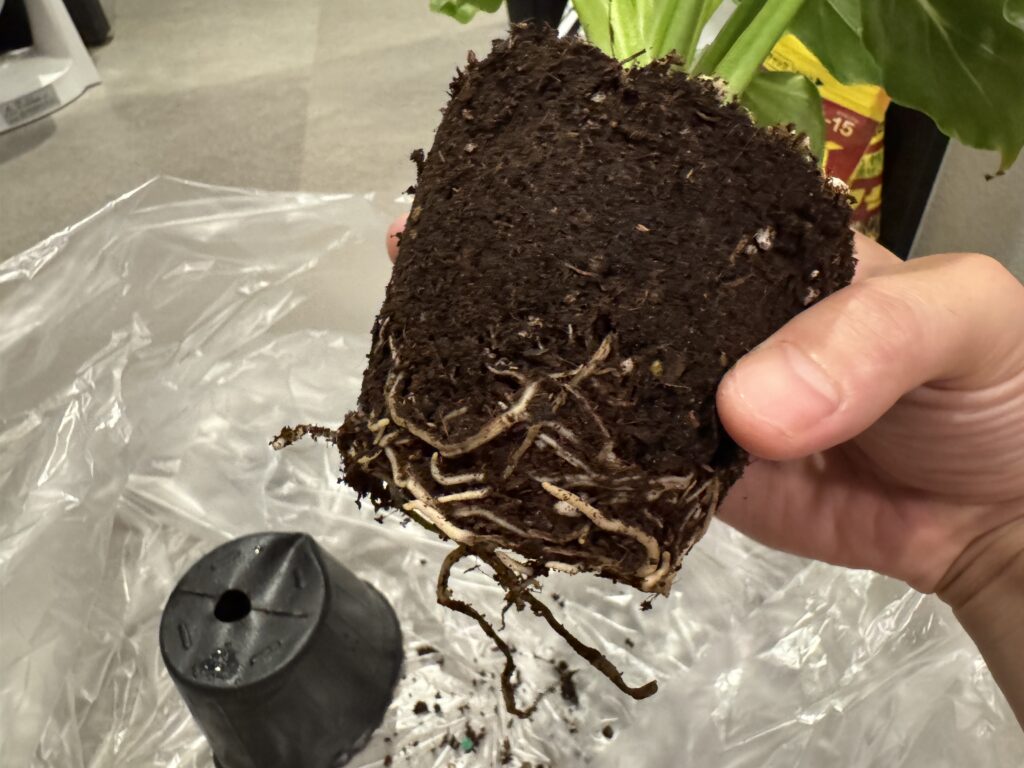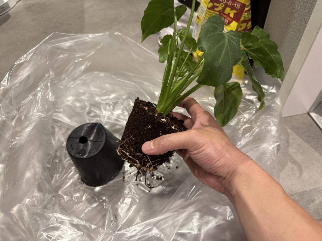 今ついている有機質の土は、根にダメージを与えない程度に取り除いて新しい鉢へ植え付けていきます。