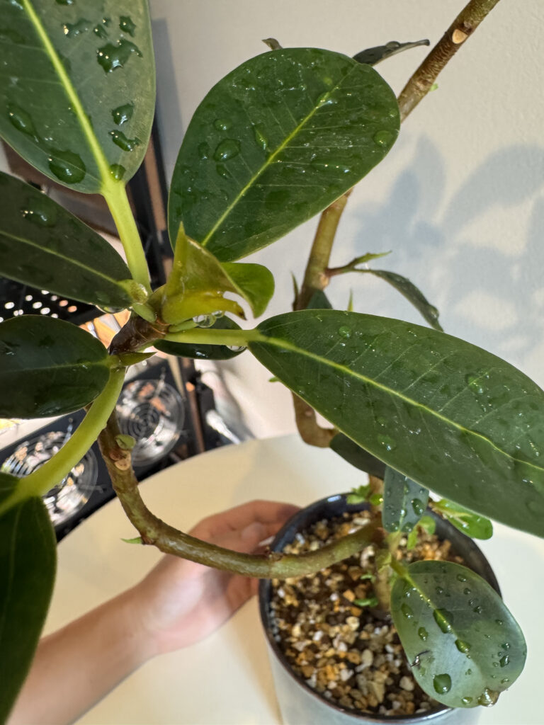 屋外管理で新芽の数がすごいフランスゴムの木(フィカス・ルビギノーサ)