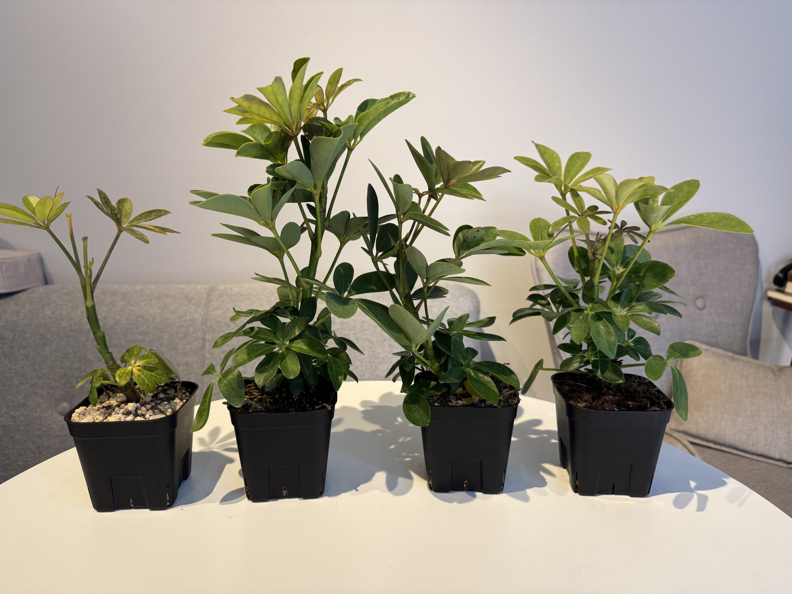 ホームセンターで販売されていたミニシェフレラ(カポック)たちを実験体に。