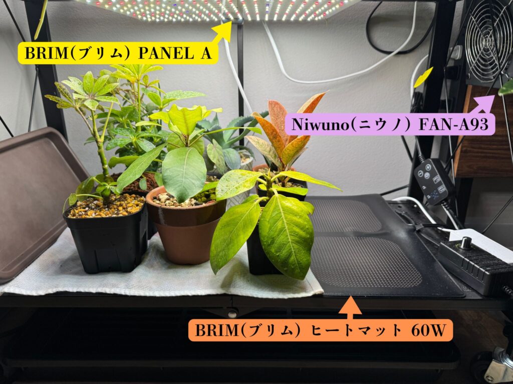 前回の記事で紹介した植物育成用ライトとサーキュレーターに加え
